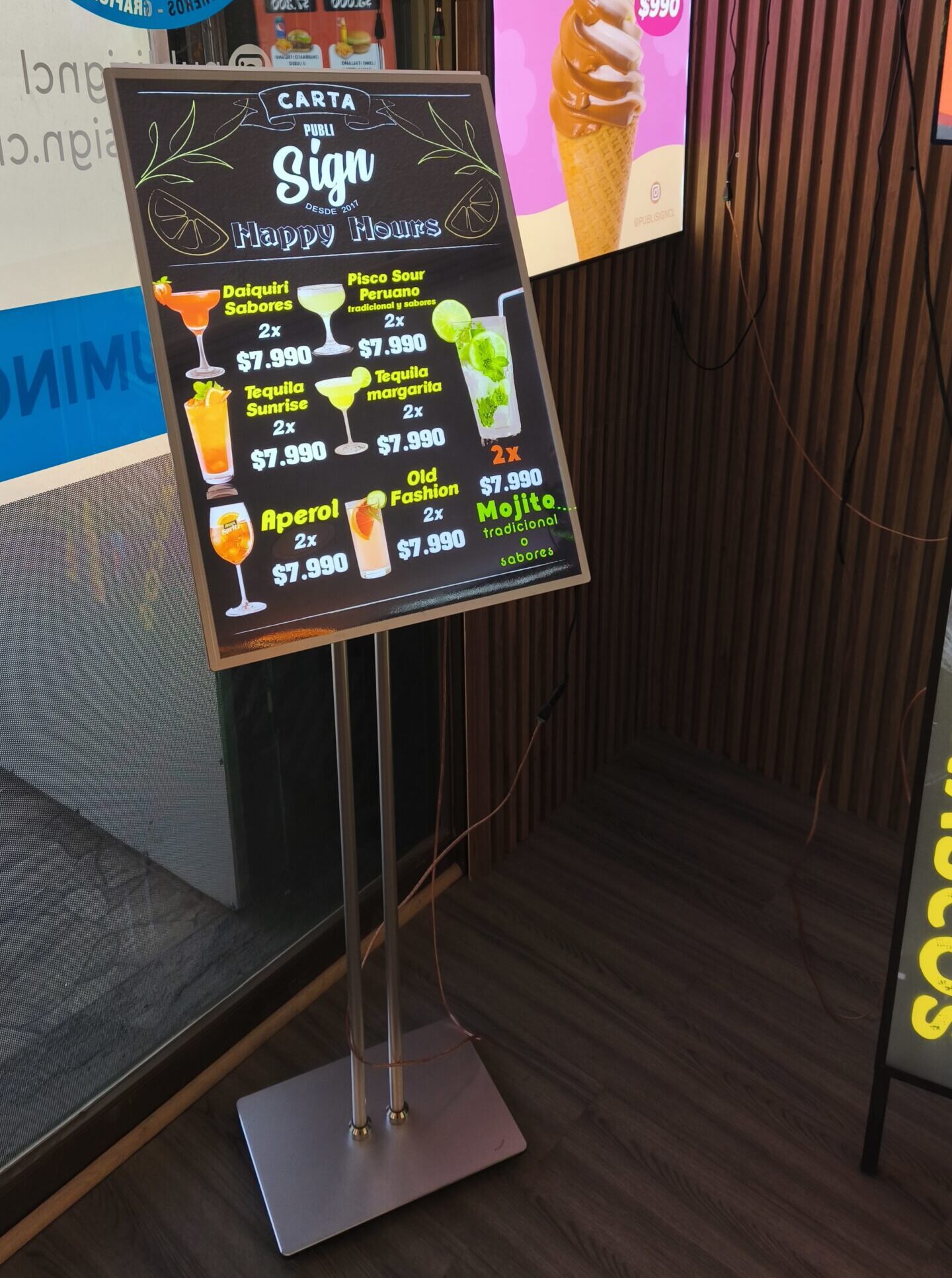 Base metálica. Altura regulable Pantalla porta gráfica, tamaño 60×40 cm. Iluminación led